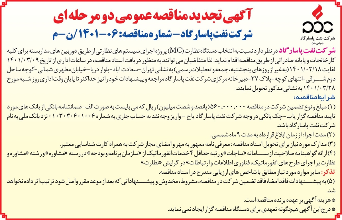 آگهی تجدید مناقصه عمومی دو مرحله ای - شرکت نفت پاسارگاد- شماره مناقصه: 06-1401/ن-م