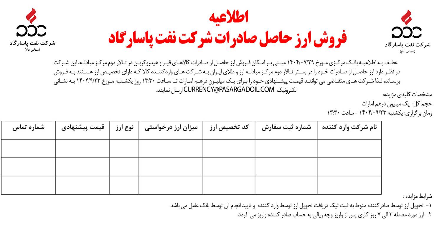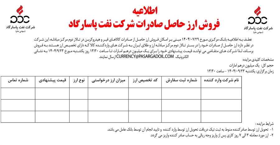 عطف به اطلاعیه بانک مرکزی مورخ 29/07/1404 مبنی بر امکان فروش ارز حاصل از صادرات کالاهای قیر و هیدروکربن در تالار دوم مرکز مبادله، این شرکت در نظر دارد ارز حاصل از صادرات خود را در بستر تالار دوم مرکز مبادله ارز و طلای ایران به شرکت های واردکننده کالا که دارای تخصیص ارز هستند به فروش برساند، لذا شرکت های متقاضی می توانند قیمت پیشنهادی خود را برای یک میلیون درهم امارات تا ساعت 13:30 روز یکشنبه مورخ 23/9/1404 به نشانی الکترونیک [email protected] ارسال نمایند.