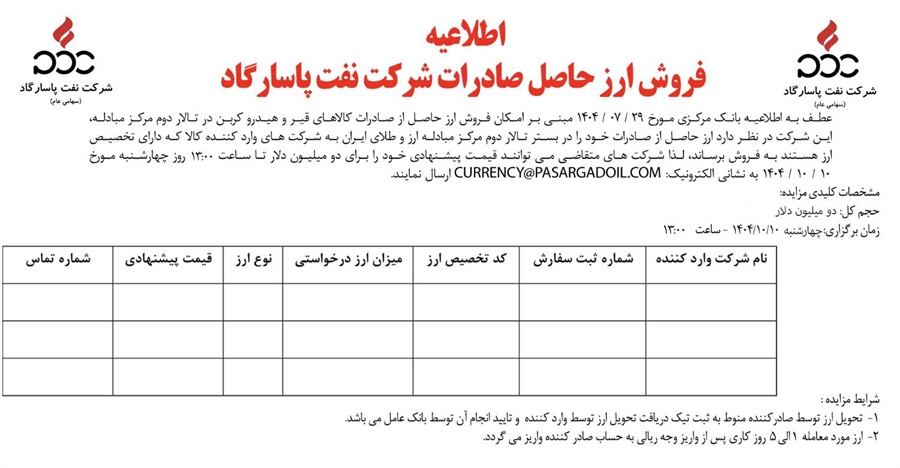 عطف به اطلاعيه بانك مركزي مورخ 29 / 07 / 1404 مبني بر امكان فروش ارز حاصل از صادرات كالاهاي قير و هيدرو كربن در تالار دوم مركز مبادله، اين شركت در نظر دارد ارز حاصل از صادرات خود را در بستر تالار دوم مركز مبادله ارز و طلاي ايران به شركت هاي وارد كننده كالا كه داراي تخصيص ارز هستند به فروش برساند، لذا شركت هاي متقاضي مي توانند قيمت پيشنهادي خود را براي دو ميليون دلار تا ساعت ۱۳:00 روز چهارشنبه مورخ 10 / 10 / 1404 به نشاني الكترونيك: [email protected] ارسال نمايند.